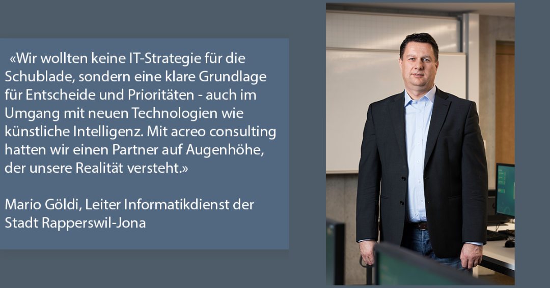 Rapperswil-Jona entschied sich bewusst für eine umfassende Neuausrichtung mit externer Unterstützung. Gemeinsam mit acreo consulting wurde die IT von Organisation und Prozessen über Applikationen und Security bis zur Infrastruktur hinweg strukturiert analysiert. Dabei wurde auch geprüft, wie die neuen Technologien sinnvoll und verantwortungsvoll in der Verwaltung eingesetzt werden können.